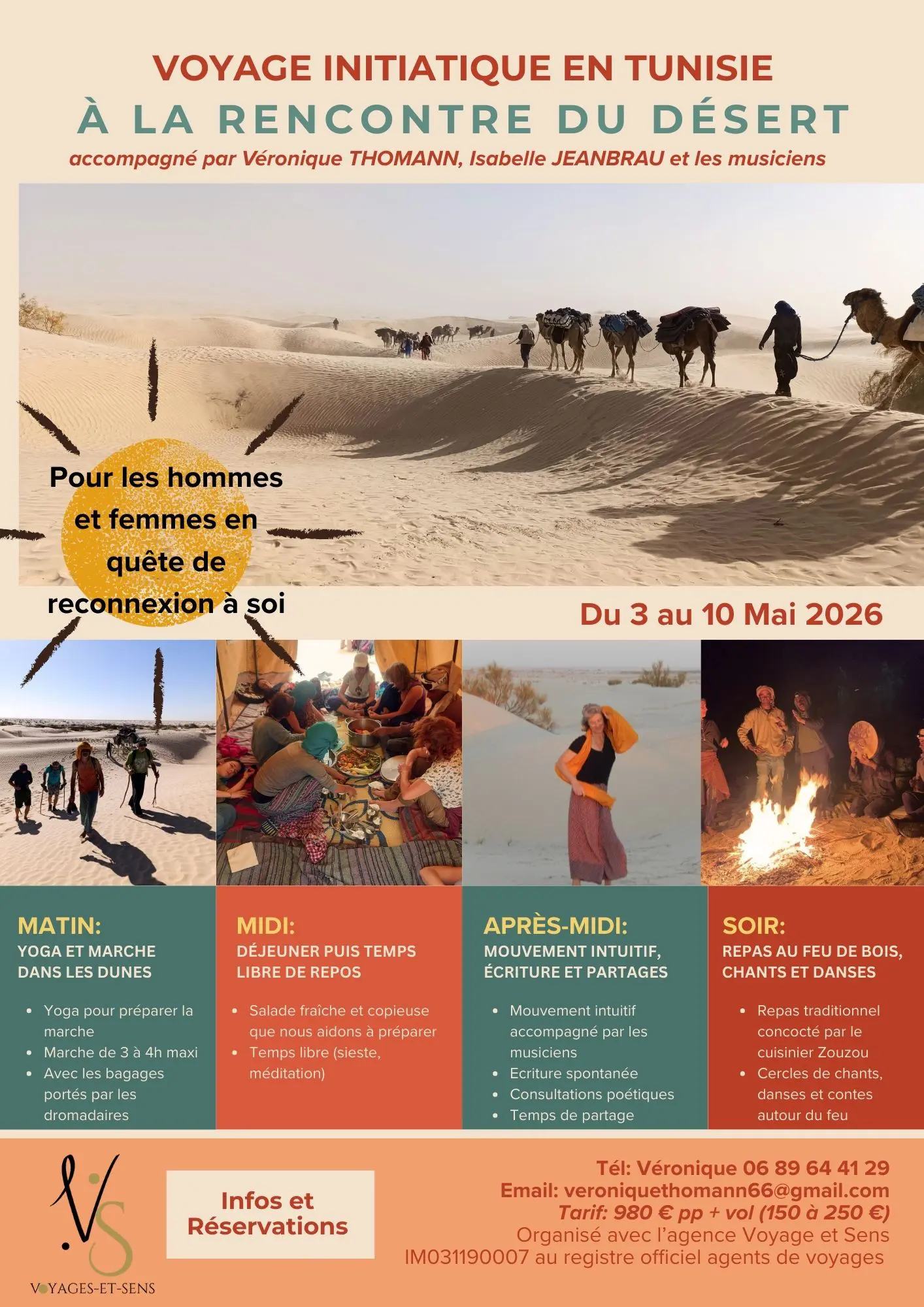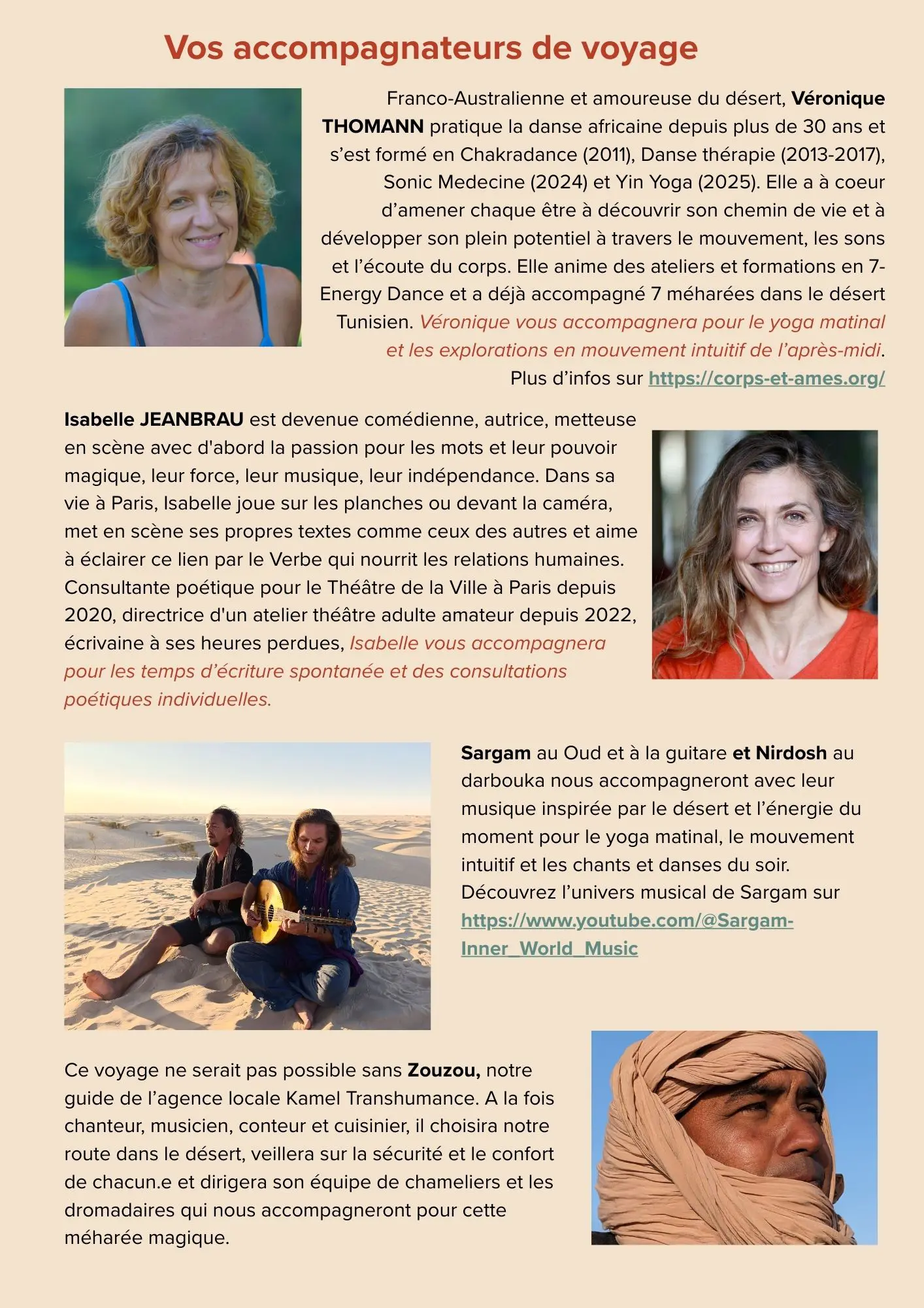 Franco-Australienne et amoureuse du désert, Véronique THOMANN pratique la danse africaine depuis plus de 30 ans et s’est formé en Chakradance (2011), Danse thérapie (2013-2017), Sonic Medecine (2024) et Yin Yoga (2025). Elle a à coeur d’amener chaque être à découvrir son chemin de vie et à développer son plein potentiel à travers le mouvement, les sons et l’écoute du corps. Elle anime des ateliers et formations en 7-Energy Dance et a déjà accompagné 7 méharées dans le désert Tunisien. Véronique vous accompagnera pour le yoga matinal et les explorations en mouvement intuitif de l’après-midi.